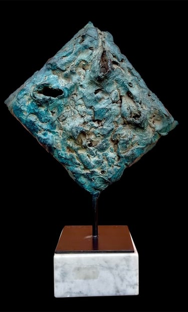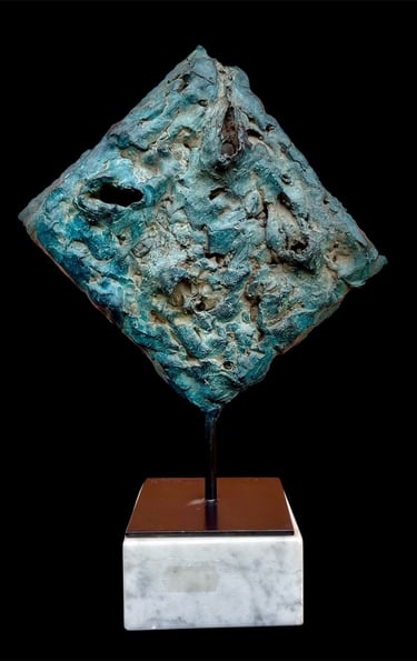 La patine verte, bleut aux reflets changeants, rappelle les algues bercées par le courant, les écailles d’un poisson mythique ou encore la texture des pierres polies par le ressac. Chaque facette de ce triangle sculptural joue avec la lumière, tantôt évoquant la crête d’une vague déferlante, tantôt la voile d’un navire en quête d’horizons lointains.