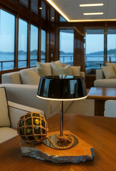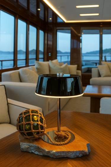 Posées sur un bloc de granite et feuilles d or ou platine, ces pièces racontent des récits de mer ...de départs audacieux, de silences d’abîme et de vents contraires. Chaque lampe devient alors bien plus qu’un objet : une balise dans nos intérieurs, un hommage lumineux aux profondeurs et à l’ingéniosité humaine.