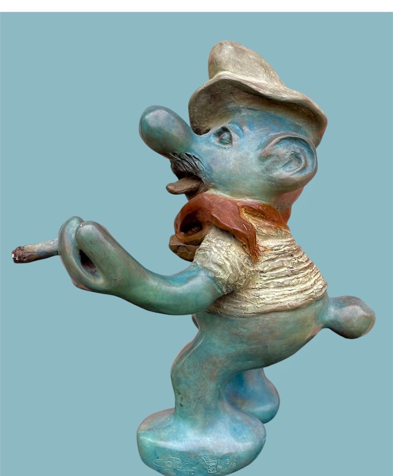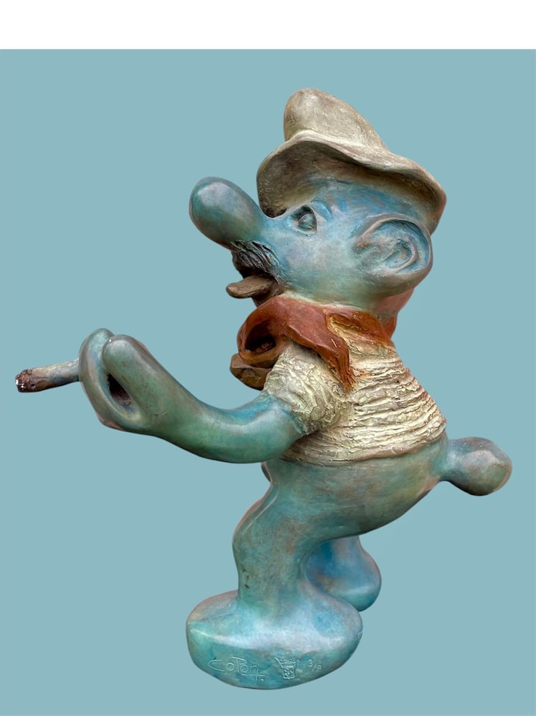 Cette sculpture représente une interprétation décalée et caricaturale d’un Schtroumpf avec une attitude très française, façon vieux briscard. D’abord, il est bleu, bien sûr, mais avec une teinte plus patinée, presque vieillie. Il porte un béret incliné d’un air nonchalant, renforçant son côté “franchouillard”. Sa moustache et sa barbe incomplète lui donnent une allure de vieux routier ou de paysan aguerri. Il est habillé d’un pull texturé, style tricot rustique, et d’un foulard noué autour du cou, une touche typiquement française qui évoque les artistes bohèmes ou les habitués des bistrots.
