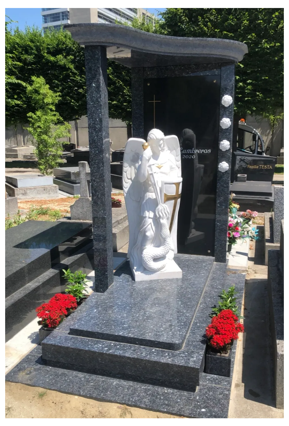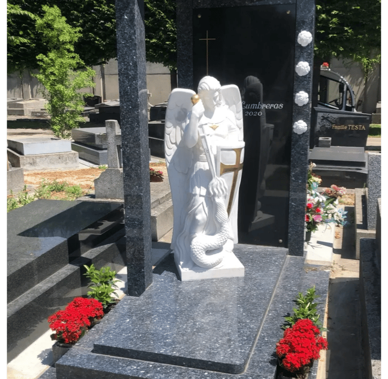 Cette sculpture en marbre est une pièce unique, réalisée sur commande spéciale. Elle représente un ange majestueux, inspiré de l’archange Saint Michel, dans une posture de victoire et de sérénité pour l' éternitée.