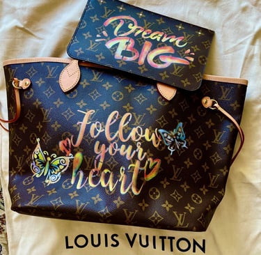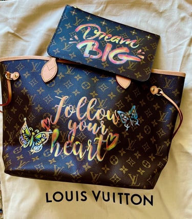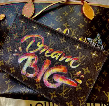 Les inscriptions "Dream BIG" sur la pochette et "Follow your heart" sur le sac principal ajoutent une touche d'inspiration et de positivité. Les lettres, aux tons chauds et dégradés, semblent presque lumineuses sur le fond foncé du cuir. Deux papillons aux détails artistiques viennent compléter cette œuvre, symbolisant la liberté et la transformation.