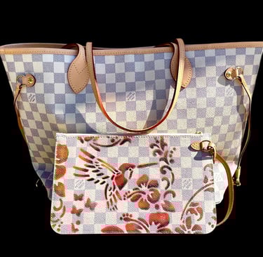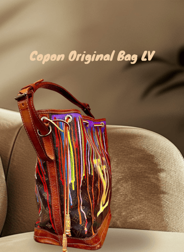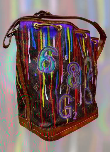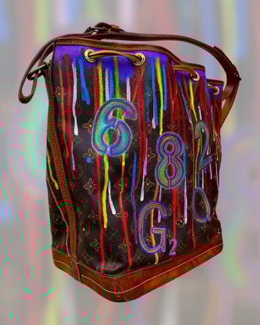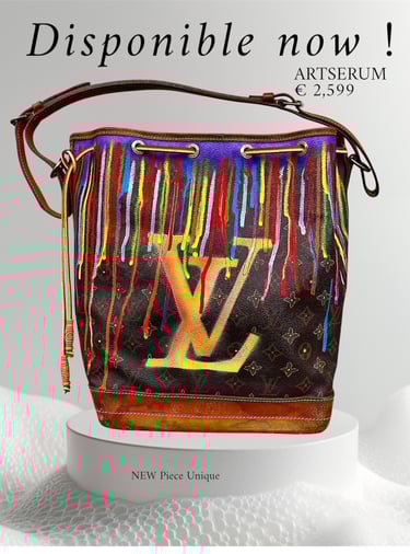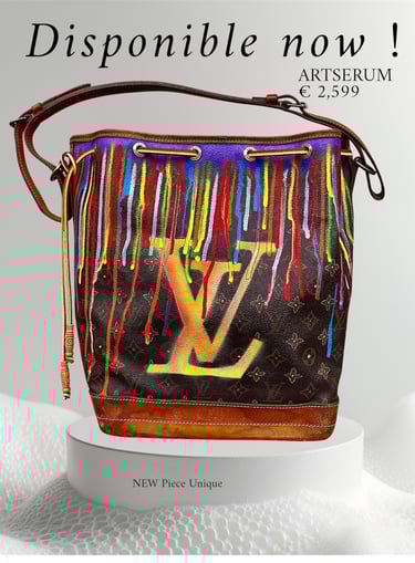 Ce sac est une véritable œuvre d’art à lui tout seul, un mariage audacieux entre luxe intemporel et expression artistique contemporaine. Sur la base iconique du monogramme Louis Vuitton, l’artiste a apposé un déluge de couleurs vives, comme des coulures de peinture fluo qui tombent en cascade depuis le haut du sac. Ces touches de rouge, bleu, rose, jaune, vert et violet insufflent une énergie explosive et donnent une dimension vivante et unique à la pièce. Le grand logo "LV", revisité en dégradé jaune-orangé, semble émerger de ce chaos chromatique avec puissance, comme une signature assumée et vibrante. Chaque détail – de la peinture artisanale à la finition en cuir brun caramel , raconte une histoire de créativité, de liberté et d'exclusivité.