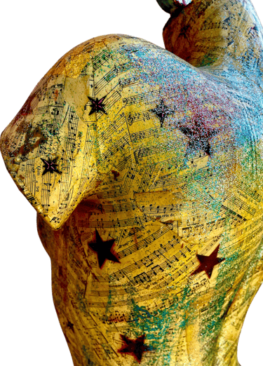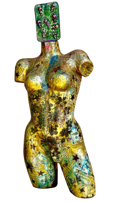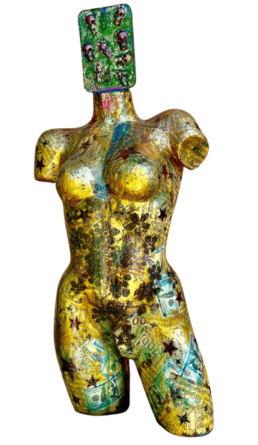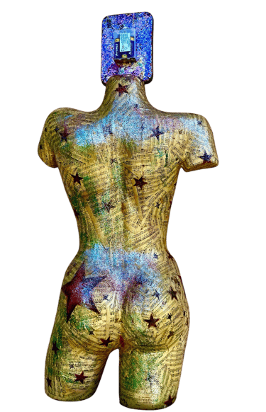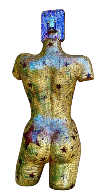 Cette sculpture vintage montée en lampe est une pièce unique et très décorative. Elle est composée d’un buste de mannequin, peint avec un mélange explosif de couleurs vives et texturées, créant un effet abstrait et dynamique. Le buste est fixé sur un pied métallique réglable monté sur roulettes, ajoutant une touche industrielle et pratique à l’ensemble.