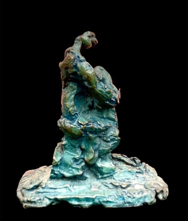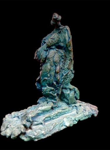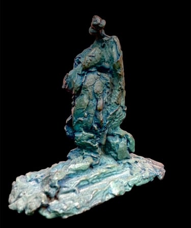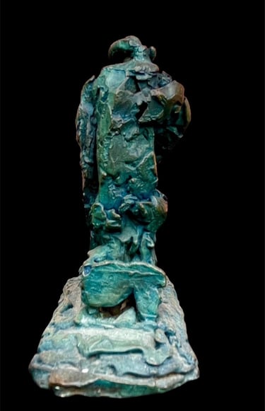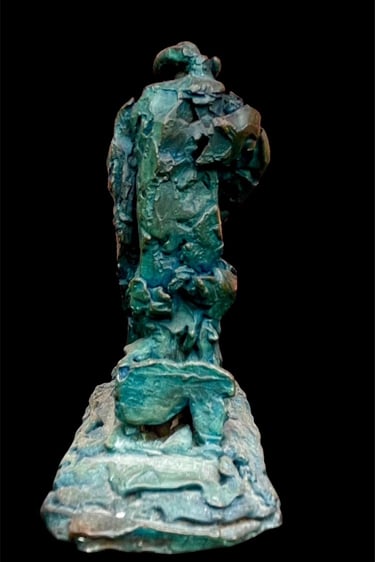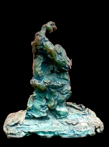 Cette sculpture en bronze est une pièce unique, alliant abstraction et expression figurative. De petite taille, elle possède une présence forte et singulière. Les formes organiques et texturées évoquent un personnage en mouvement ou en contemplation, sculpté avec une approche brute et expressive. La patine aux teintes vertes et bleutées confère à l’œuvre un aspect intemporel et presque minéral.Chaque détail semble raconter une histoire, laissant place à l’interprétation et à l’émotion du spectateur. C'est une création parfaite pour les vrais collectionneurs, où la taille ne fait pas la valeur, mais où l’unicité et l’âme de l’œuvre priment.