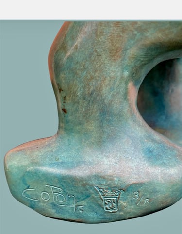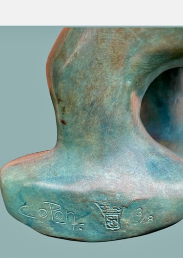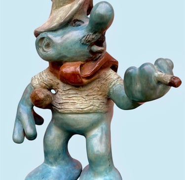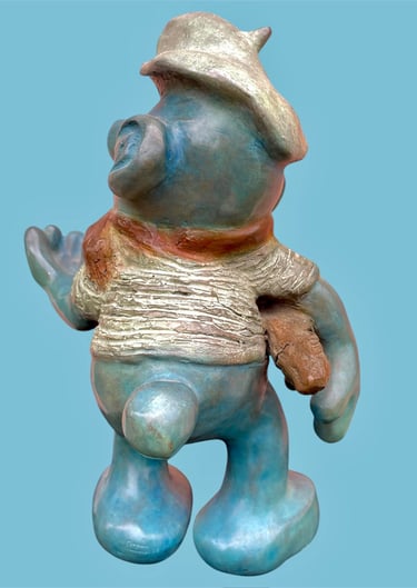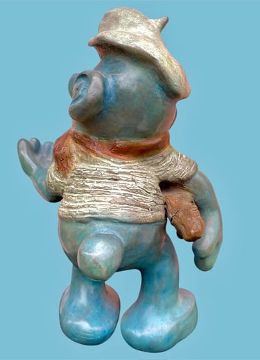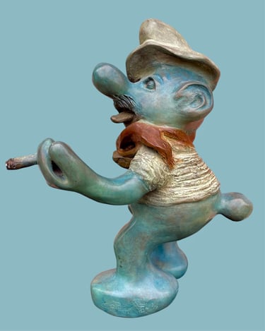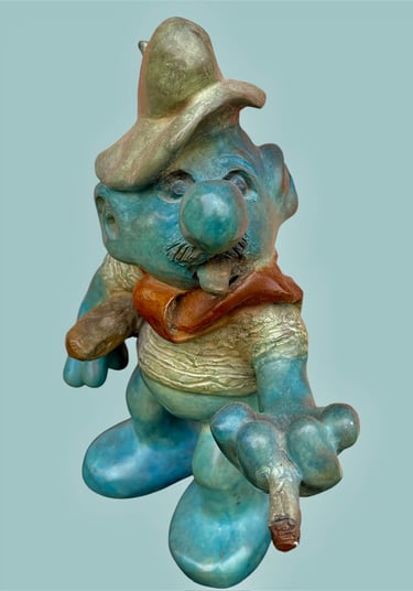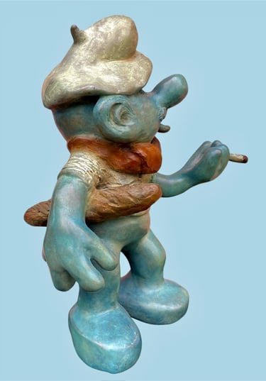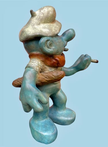 Cette sculpture représente une interprétation décalée et caricaturale d’un Schtroumpf avec une attitude très française, façon vieux briscard. D’abord, il est bleu, bien sûr, mais avec une teinte plus patinée, presque vieillie. Il porte un béret incliné d’un air nonchalant, renforçant son côté “franchouillard”. Sa moustache et sa barbe incomplète lui donnent une allure de vieux routier ou de paysan aguerri. Il est habillé d’un pull texturé, style tricot rustique, et d’un foulard noué autour du cou, une touche typiquement française qui évoque les artistes bohèmes ou les habitués des bistrots.