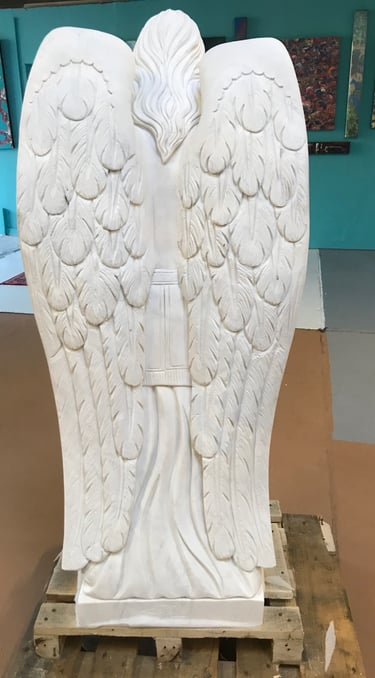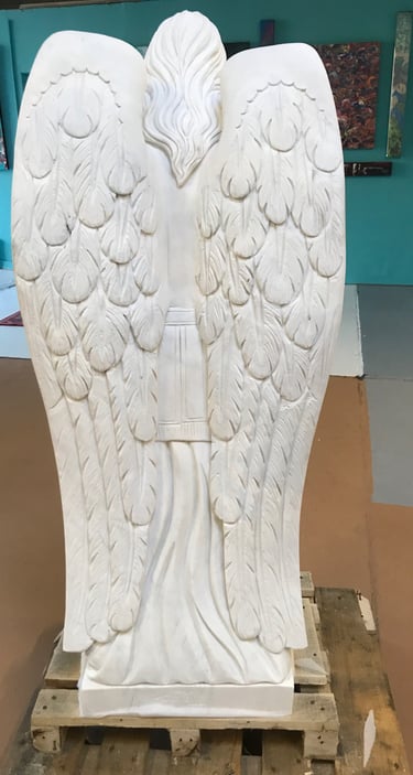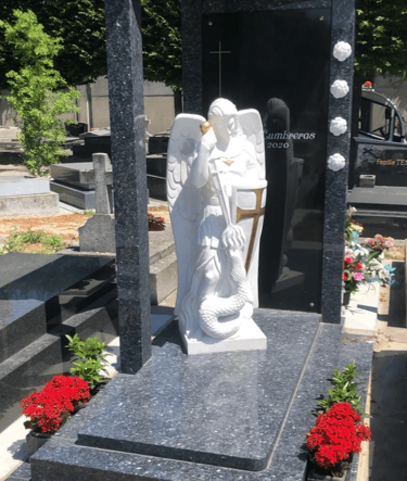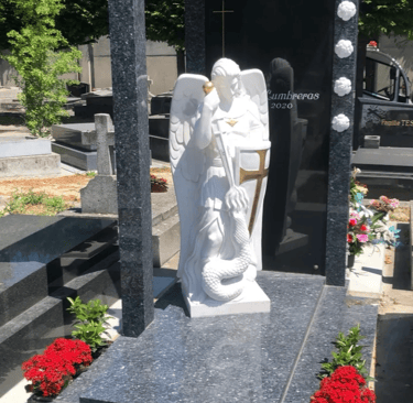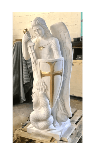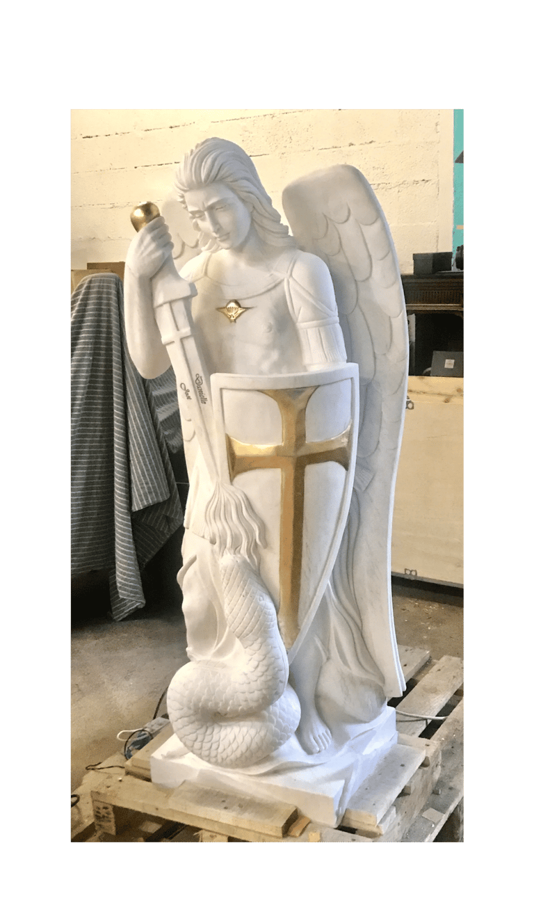 Cette sculpture en marbre est une pièce unique, réalisée sur commande spéciale. Elle représente un ange majestueux, inspiré de l’archange Saint Michel, dans une posture de victoire et de sérénité pour l' éternitée.