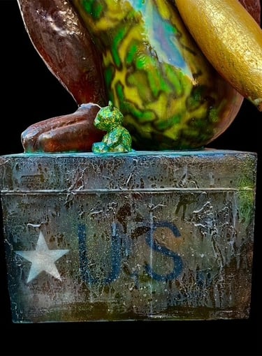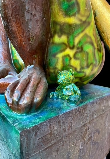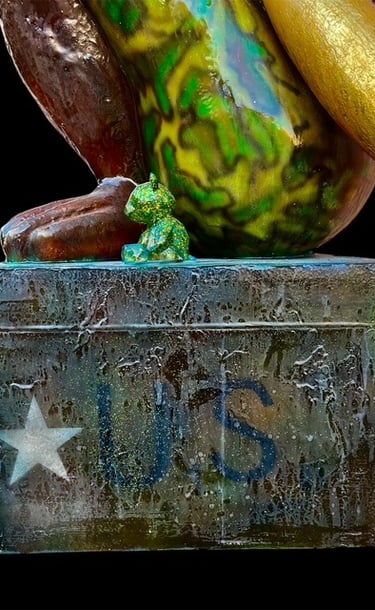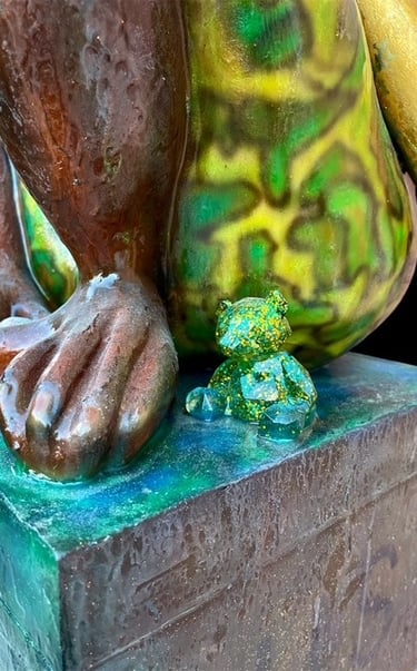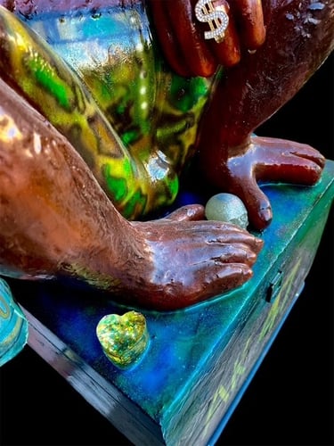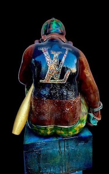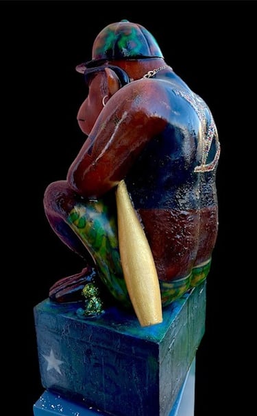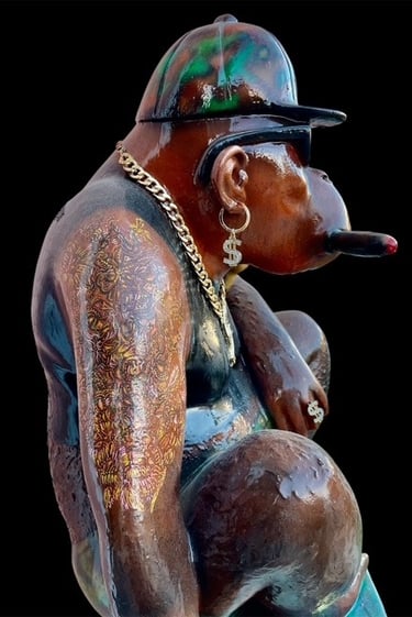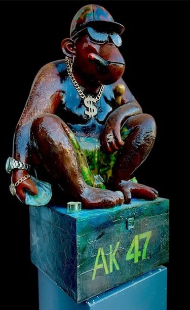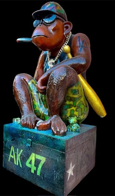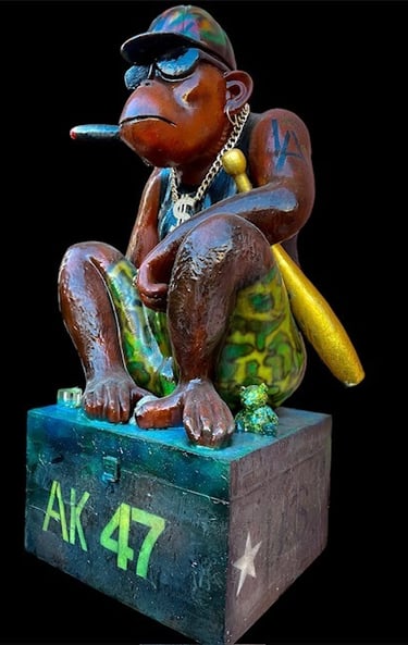 Plongez dans l’univers décalé et percutant de "King of the Street", une pièce d’art unique qui ne laisse personne indifférent. Conçue en résine avec un réalisme saisissant, cette sculpture incarne l’attitude rebelle et charismatique d’un singe urbain, prêt à régner sur son territoire. Un style badass et assumé : Avec son regard perçant caché sous des lunettes noires, son cigare allumé et sa chaîne en or, ce primate impose son aura de leader. Il est vêtu d’un short camouflage et porte un tatouage sur le bras, symbole d’un esprit libre et intrépide. L’accessoire qui fait la différence : Armé d’une batte de baseball dorée, il envoie un message clair : ici, c’est lui le boss ! Son attitude nonchalante et son expression sérieuse lui confèrent une force incroyable.Une base street-art explosive : Posé sur un coffre marqué AK 47, il affiche son ADN urbain avec des tags et une étoile discrète qui rappellent l’univers underground et artistique des ruelles sombres.