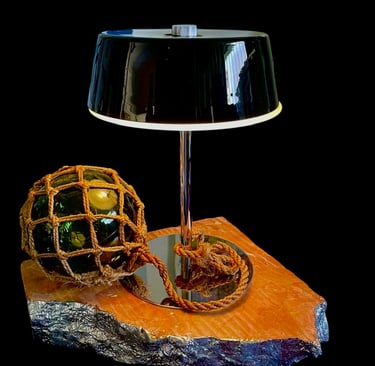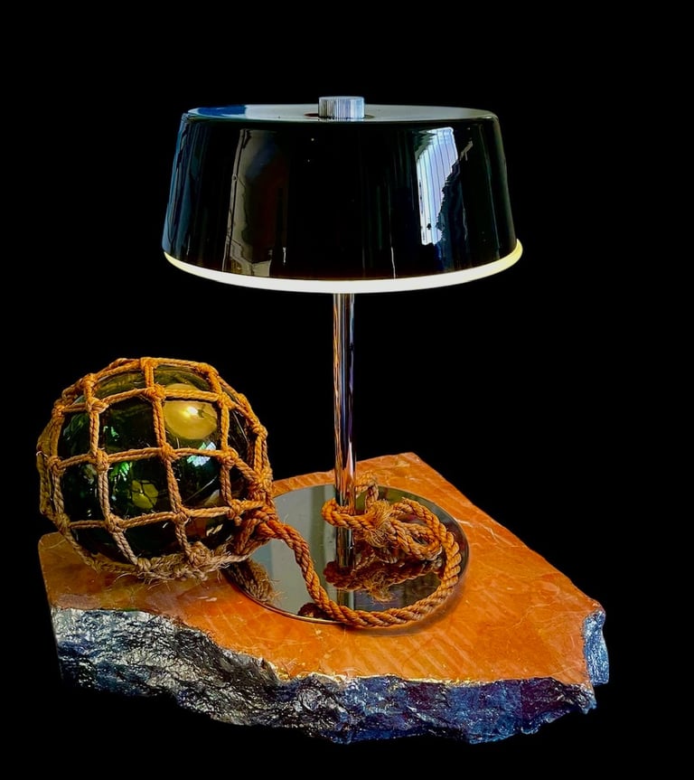 Pièce unique d’exception Cette sculpture-lampe incarne l’alliance parfaite entre art brut et design contemporain. Ancrée sur une base de pierre naturelle taillée avec audace, elle dévoile un jeu de contrastes : un globe en verre soufflé, captif dans un filet de corde tressée à la main, évoque l’univers marin avec élégance. Le tout est sublimé par une tige chromée et un abat-jour laqué noir, à la silhouette sobre et raffinée.