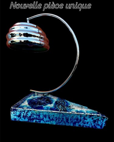Œuvre unique Dans cette création saisissante, Sylvain Copon transcende la fonction utilitaire de la lampe pour en faire un véritable manifeste artistique. L’œuvre se déploie autour d’une courbe métallique élégante, presque céleste, qui élève la lumière comme un objet sacré. Le bras en arc tendu, chromé et fluide, semble capter l’énergie d’un autre monde, comme un lien entre le ciel et la matière. Le socle, une base triangulaire en céramique émaillée bleue, évoque une croûte terrestre en pleine mutation. Ses textures craquelées, ses reliefs mystérieux et ses nuances de bleu électrique évoquent l’eau, la glace, le feu contenu — une alchimie minérale vibrante. Il semble extrait d’une géologie imaginaire, témoin d’un monde oublié.