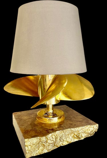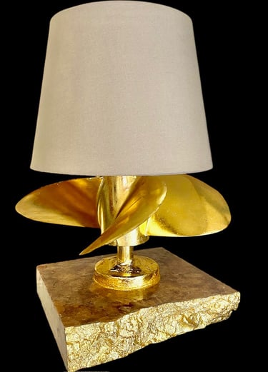 Pièce unique – Œuvre contemporaine fonctionnelle . Cette lampe sculpturale singulière, intitulée "Hélice d'Or", fusionne puissance industrielle et raffinement artistique dans une création à la fois lumineuse et symbolique.