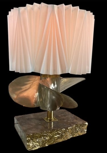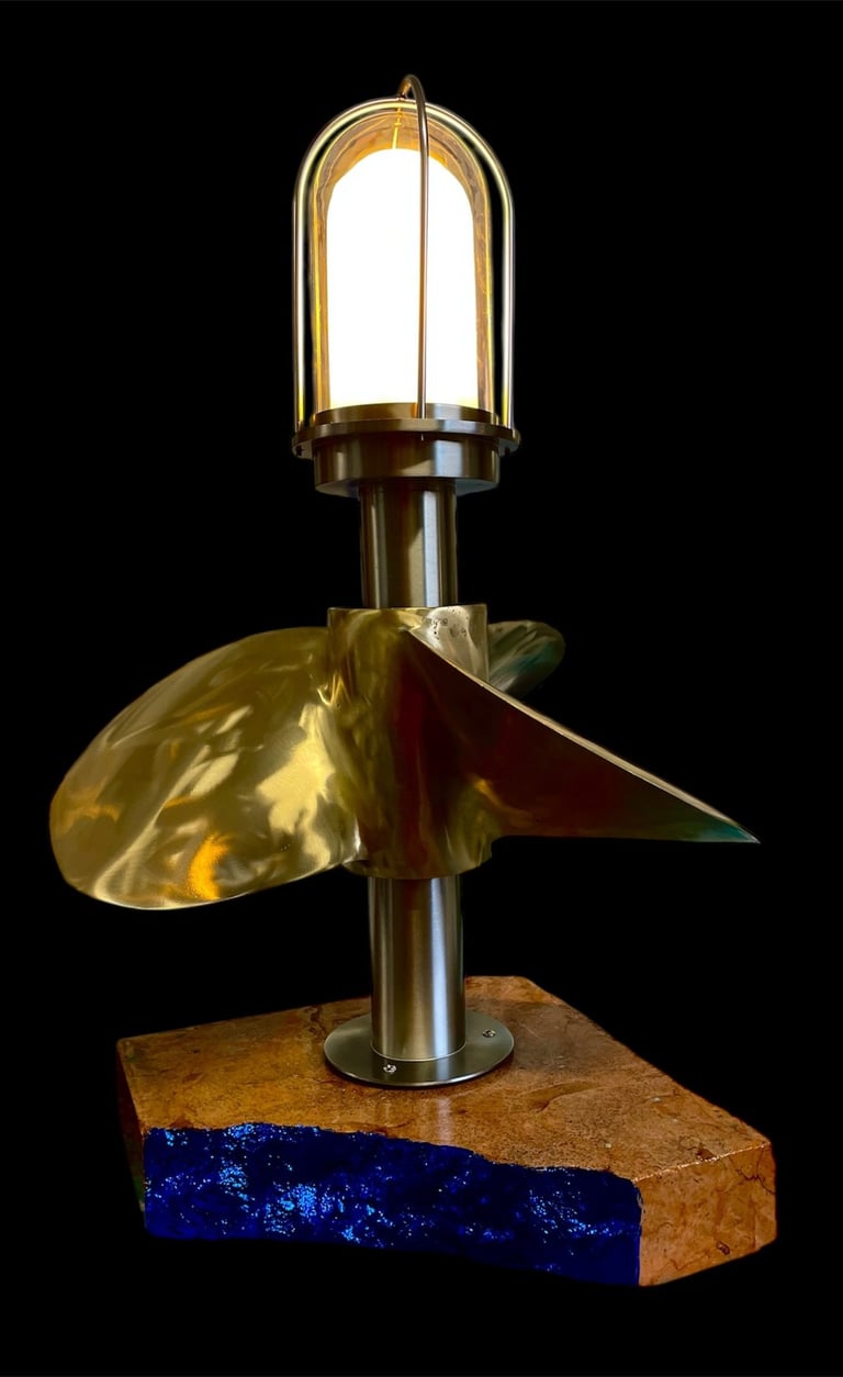 Fusion entre art maritime, design industriel et matière minérale, L’Hélice des Lumières est une sculpture-lampe qui interroge le lien entre mouvement et lumière. Cette œuvre contemporaine transforme un objet technique – une hélice marine – en symbole poétique figé dans le temps.