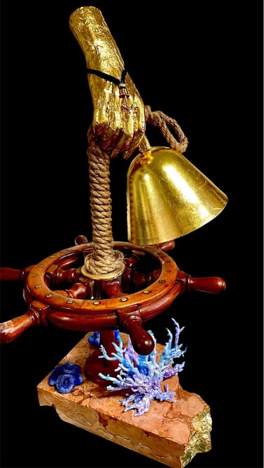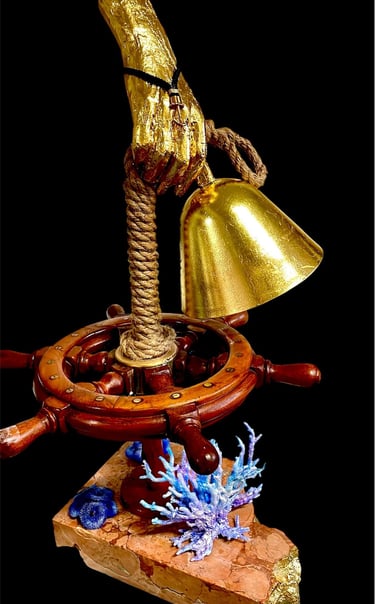 Cette œuvre singulière fusionne avec poésie les symboles de la mer et du voyage intérieur. Une main dorée à la feuille d’or, suspendue à une corde brute, tient une cloche de navire elle aussi dorée a le feuille d or et qui fait fonction de lampe LED, prête à sonner l'appel de l'invisible. Le tout repose sur un gouvernail ancien en bois massif, emblème du cap que chacun choisit dans sa propre odyssée.
