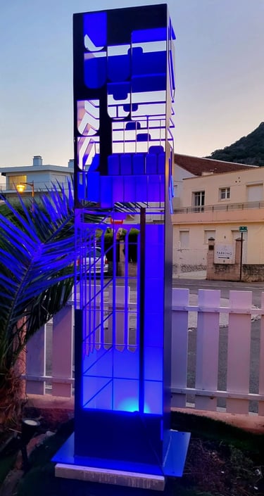 La structure est sublimée par un éclairage LED aux teintes bleutées, qui met en valeur ses lignes et ses formes graphiques, donnant un effet presque futuriste. Selon l’angle de vue et l’éclairage ambiant, les reflets et projections de lumière varient, rendant l’œuvre dynamique et immersive.