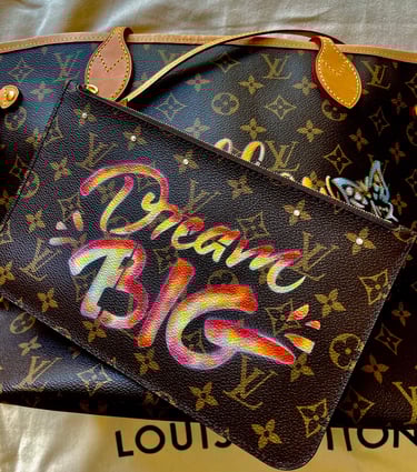Les inscriptions "Dream BIG" sur la pochette et "Follow your heart" sur le sac principal ajoutent une touche d'inspiration et de positivité. Les lettres, aux tons chauds et dégradés, semblent presque lumineuses sur le fond foncé du cuir. Deux papillons aux détails artistiques viennent compléter cette œuvre, symbolisant la liberté et la transformation.