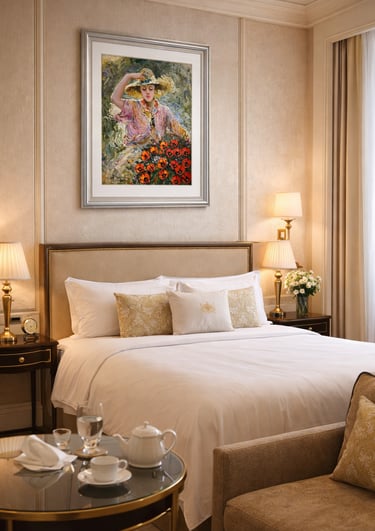 Dans une chambre d’hôtel, l’art contemporain premium crée une atmosphère intime, raffinée et profondément immersive. Une œuvre originale apporte une présence subtile mais marquante, transformant l’espace en un lieu de bien-être, d’émotion et de distinction.